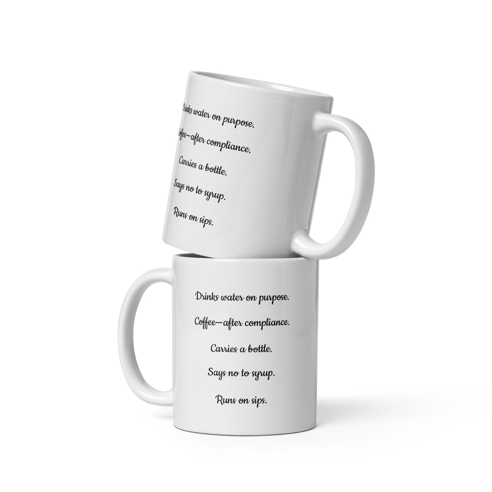 For those who drink water with intention. A clean, white ceramic mug with a mindful quote — reminding you to hydrate, skip the syrup, and keep your energy steady.
